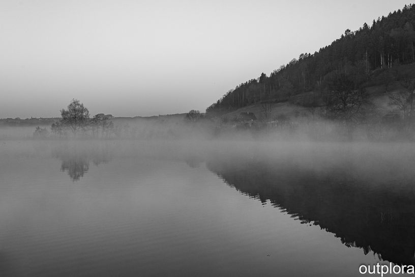 Trockene und kalte Luft sorgt am Morgen über der wärmeren Wasseroberfläche für Nebelschleier. Die Luftschicht direkt über dem Wasser wird aufgeheizt. Wasserdampf bildet sich und wird zu Nebel. Gerade im Herbst legt sich dann ein Dunst und Nebelschleier über den See. Andächtige Ruhe, unschuldige und mystische Stimmung breitet sich aus. Die Sonne lüftet den Schleier. Technik: Schwarz-Weiss-Fotografie